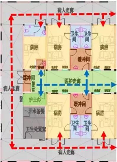 下面是武漢火神山醫院的局部病房平面圖,紅色虛線表示的是患者流線,藍色虛線表示的是醫生流線,兩種流線沒有交叉。
