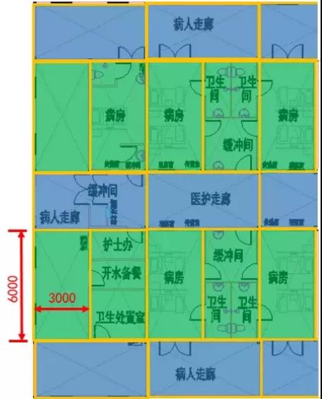 下面是火神山醫院的局部平面圖,可以看出,若干個6m*3m的模塊化尺寸通過水平與垂直方向不同的組合方式,形成了病房、衛生間、緩沖間、病人走廊、醫護走廊等等不同的功能分區,基本解決了傳染病醫院的流線及分區問題。