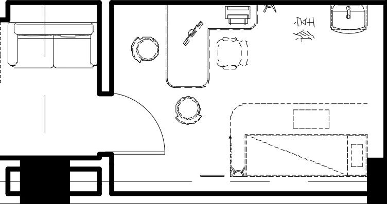 建議進行標準化布置,以滿足基本診療的需求。向內平開門并靠深側墻,門方向深側墻對側設置診桌,診桌后方同側墻距離1米以外處布置洗手盆,防止水外濺腐蝕診桌。建議使用感應式水龍頭設置,洗手盆下水管做U型彎方便檢修,洗手盆下做美觀的裝飾柜。水池上方30-50厘米以上貼墻梳妝鏡,保證門診醫生以良好的形象服務患者。檢查診床設置在洗手盆對側深側貼墻擺放,婦產科、耳鼻喉科、眼科等檢查床(椅)設備可布置在同側,朝向可根據醫生診療習慣布置。檢查床必須設置隔簾,保護隱私??照{出風口宜設置在診室門上,且側送風為最佳,可避免直吹醫生或患者,且保證室內空氣循環。